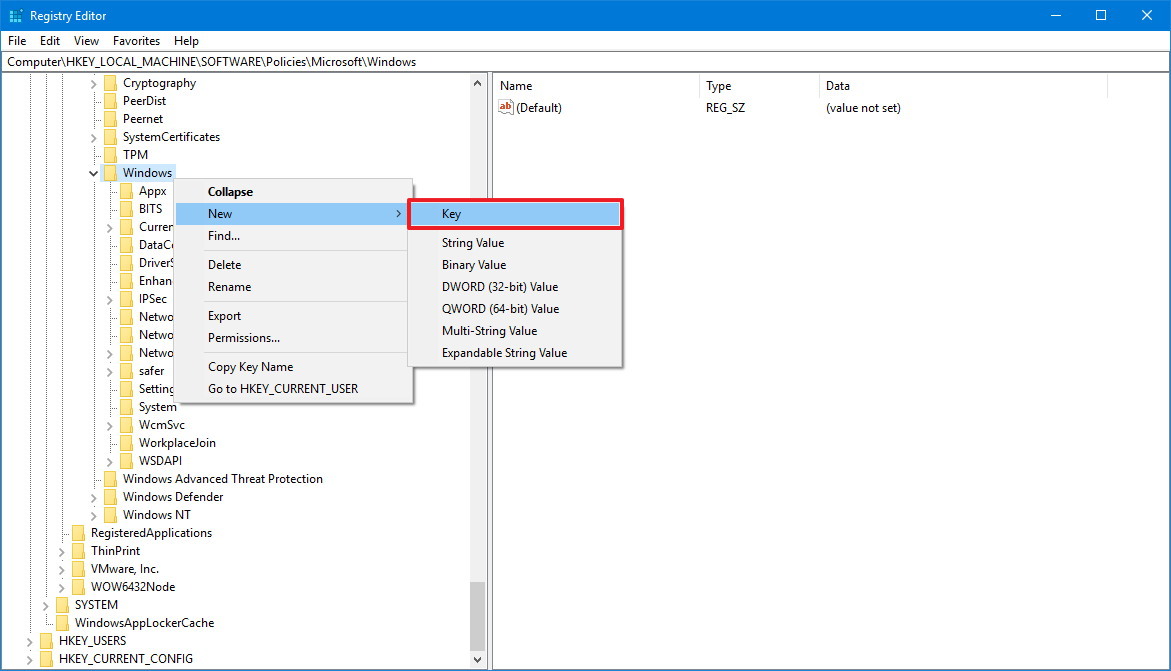 Если нужный ключ или папка не существует, создайте правильную структуру папок, создав новые подразделы в каждой папке.
